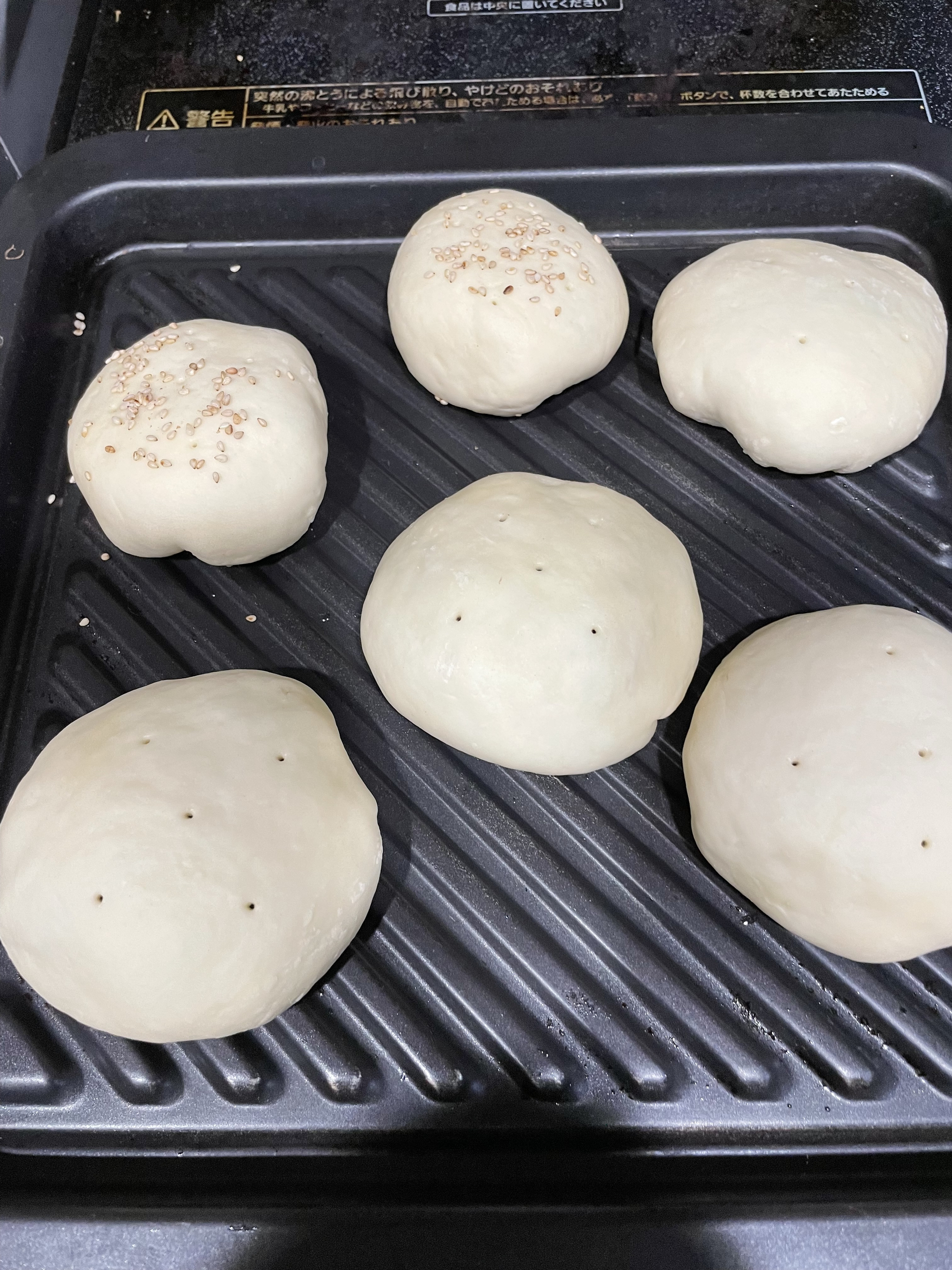 - 5箇所爪楊枝で穴を開けて、水を塗って胡麻をつける