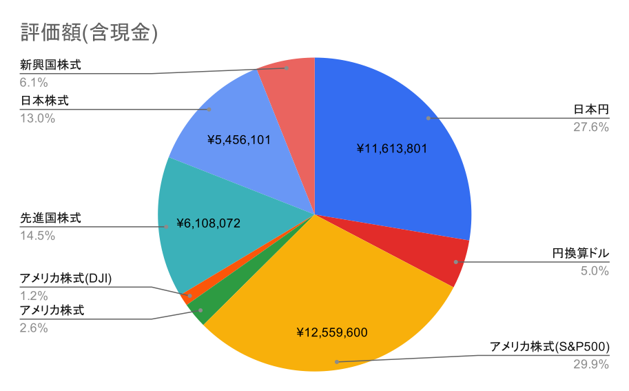 一般 NISA に入っていた投資信託を年末に解約して、新制度 NISA の成長枠で新たに買い直した。成長枠は 240 万円を年初に投資した。移行では試算配分も調整している。今後新興国は買わずに、S&P500 60%, NASDAQ 20%, TOPIX 20%にしていく。昨年 12 月は S&P 500 60%, NASDAQ 15%, TOPIX 25%を計画していたが少し割合を変えた。ここら辺は気分。日本円が多すぎなので、1000 万ぐらいまで落としたいが、買うタイミングがわからん。