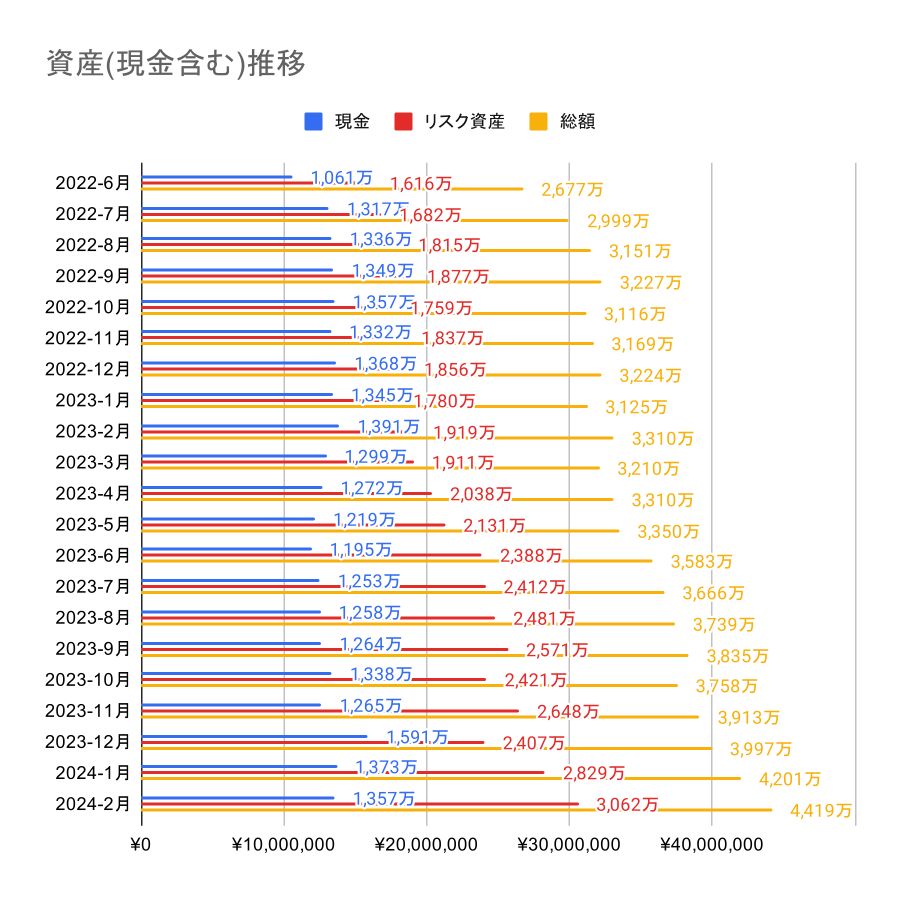 資産は大きく伸びて、4400 万を超えた。特に日本株が強く日経平均は 38915 を超えた。38915 を知っている人は怖くて買えない、知らない若い人は買える相場なのかもしれない。ここ最近は急だったが、38915 自体は越えて当然の数字のため安心して良いと思う。アメリカは予想以上に景気が強く、利下げスケジュールが遅くなりそうだが、引き続き金融相場のため長期投資前提で淡々と買っていきたい。