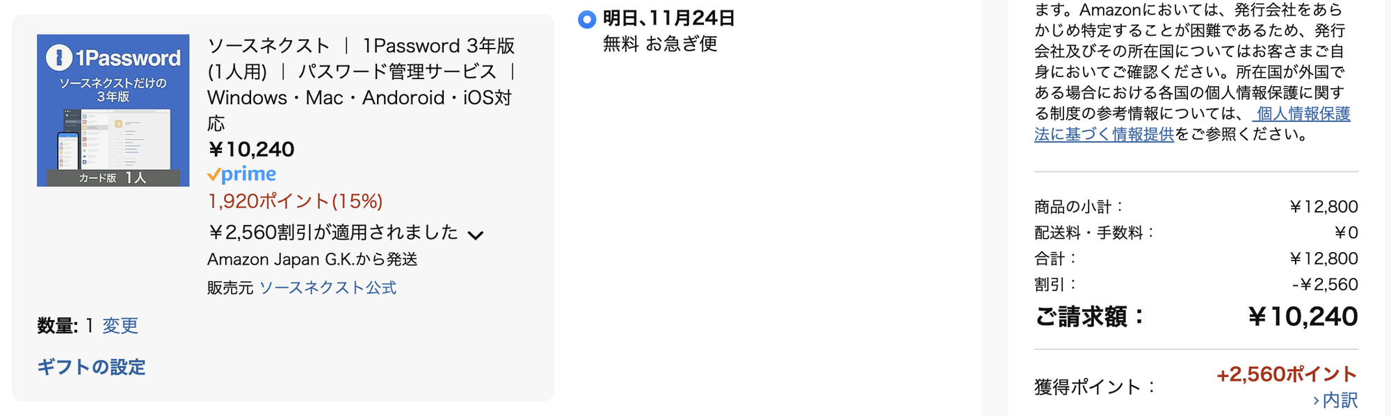 - 1password の 3 年使用権を Amazon 経由でソースネクストから購入、