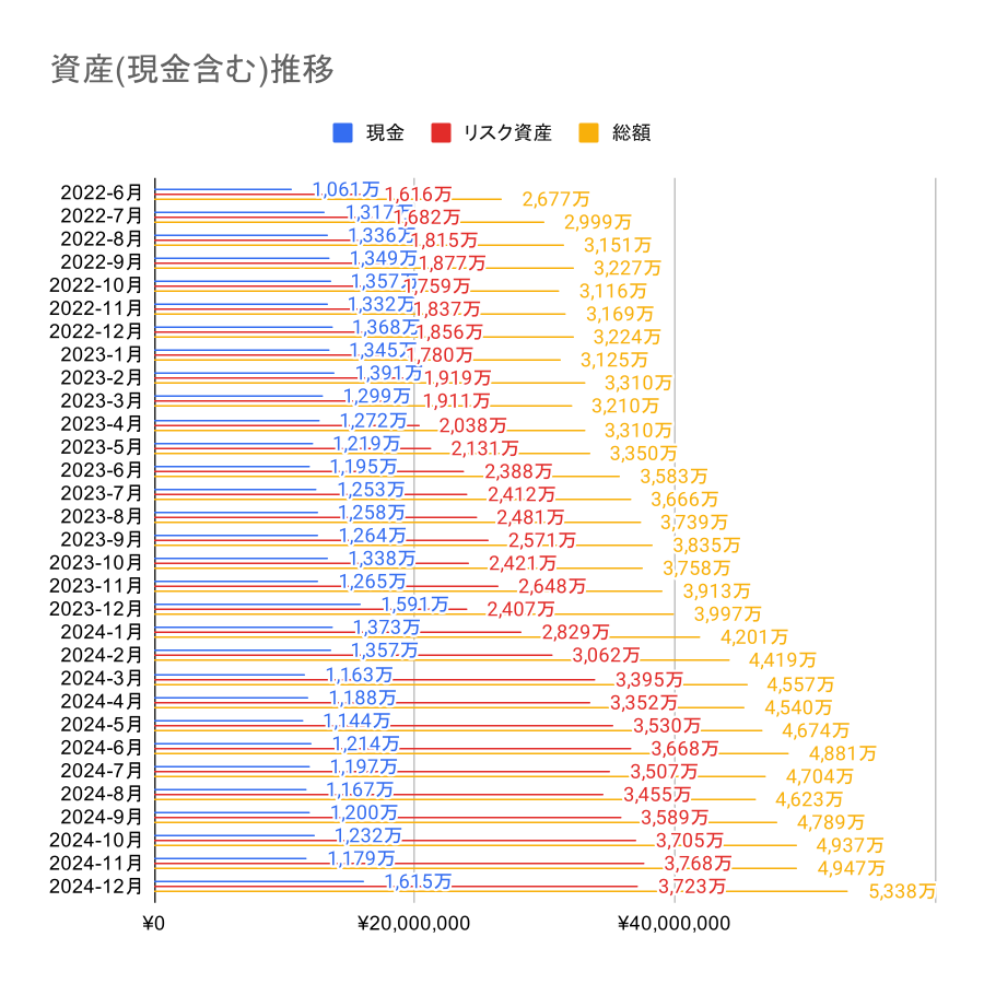 株価が大きく動く一年だったが、ひたすら指数を書い続ける投資行動を維持できた。来年の NISA も年初に一括で成長枠に投資する。S&P500 60%, NASDAQ 20%, TOPIX 20%の比率にも変化はない。今年は資産が 5,000 万を超えた、少しづつでも