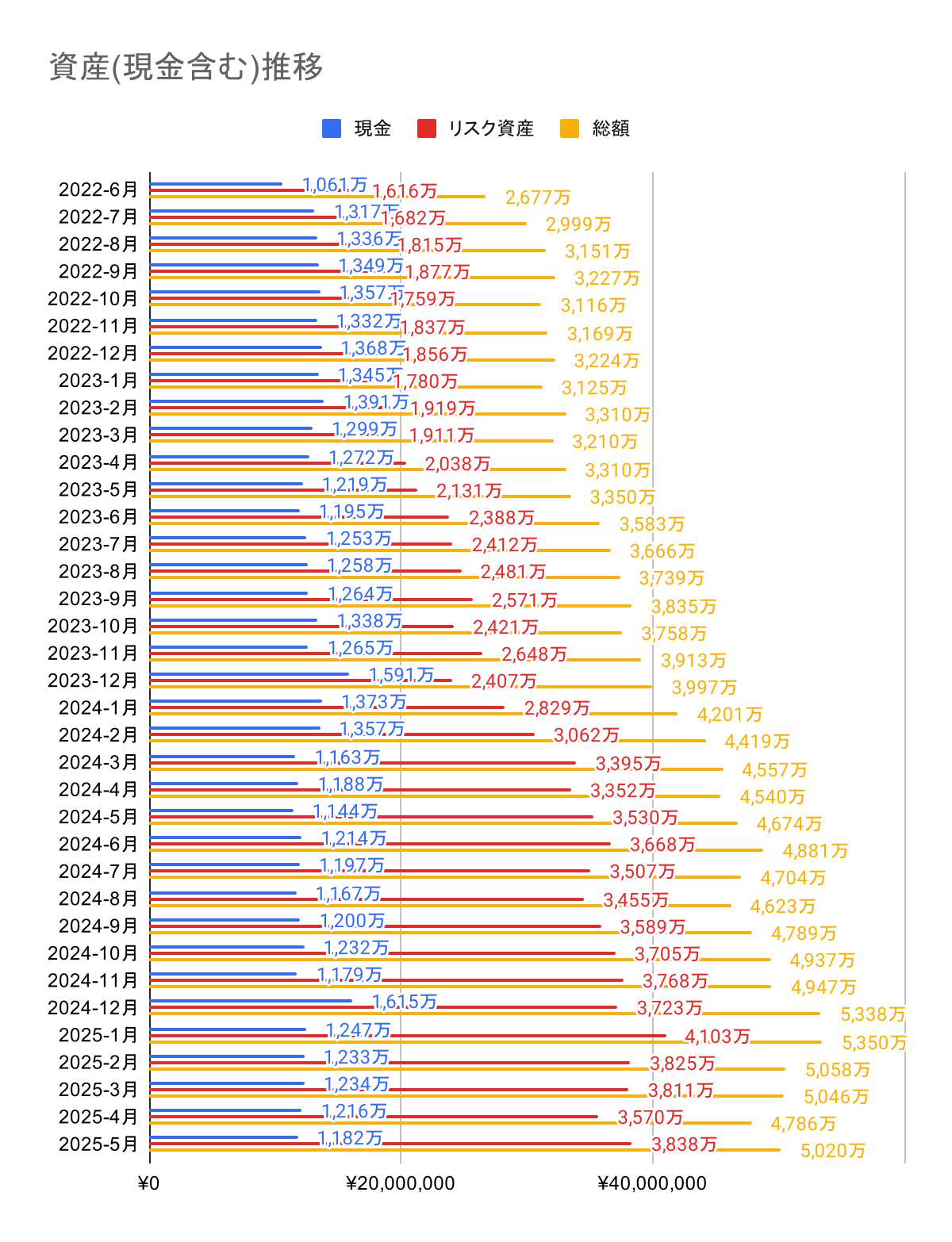 市場が落ち着いて大きな上昇となった 1 ヶ月であった。VIX も 20 前後で落ち着いている。先月売らなくて良かった、なんとか耐えられれた。アメリカは中国への関税も大幅に譲歩しており、トランプは関税飽きてるんじゃない?総資産は 5000 万円に戻した。MacBookPro を買って、固定資産税を払い、夏の旅行代を払ったので 6 月のボーナスは全て飛びそう。子育ては金がかかる。