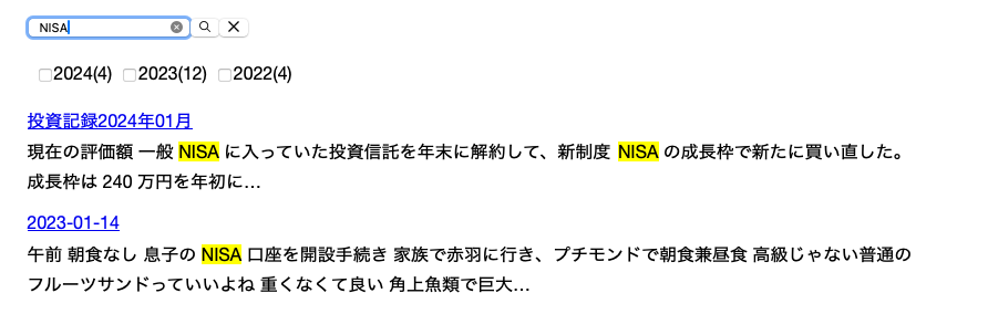 - 日記を投稿年でフィルターできるようにした。index.jsonに year の項目を足して、Meilisearch に読み込ませる。filterable-attributesに追加しないとフィルターできないため、 year のみ filterable-attributes に追加。あとは Instant Meilisearch の RefinementList を利用。またデザインの変え方を忘れてしまっていてたのだが、style.css を上書きした。便利だがちょっと遅い気がする